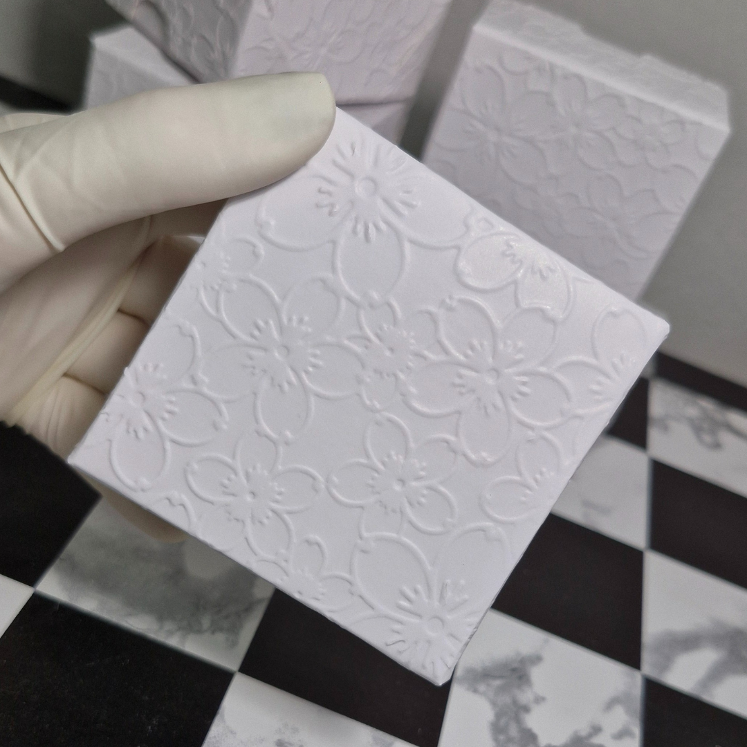 As caixinhas são brancas com a tampa estampada em 3D de flores e berço em papel de seda.